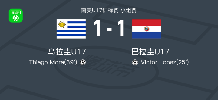 北京时间4月6日南美U17锦标赛 小组赛,乌拉圭U17对阵巴拉圭U17。乌拉圭U17Thiago Mora破门。巴拉圭U17Victor Lopez破门。最终比分乌拉圭U17 1-1 巴拉圭U17。