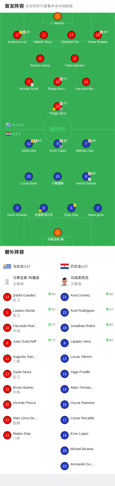 乌拉圭U17 1-1巴拉圭U17,Victor Lopez先拔头筹,Thiago Mora救主