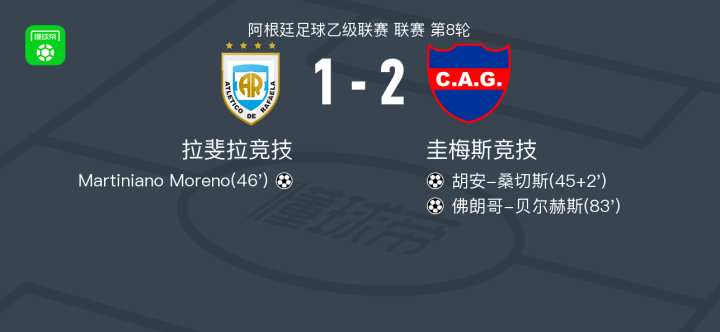 北京时间4月6日阿根廷足球乙级联赛 联赛 第8轮,拉斐拉竞技主场对阵圭梅斯竞技。拉斐拉竞技Martiniano Moreno破门。圭梅斯竞技胡安-桑切斯破门,佛朗哥-贝尔赫斯破门。最终比分拉斐拉竞技 1-2 圭梅斯竞技。