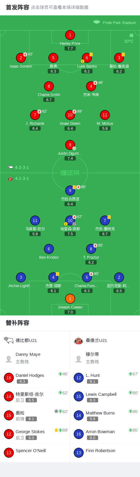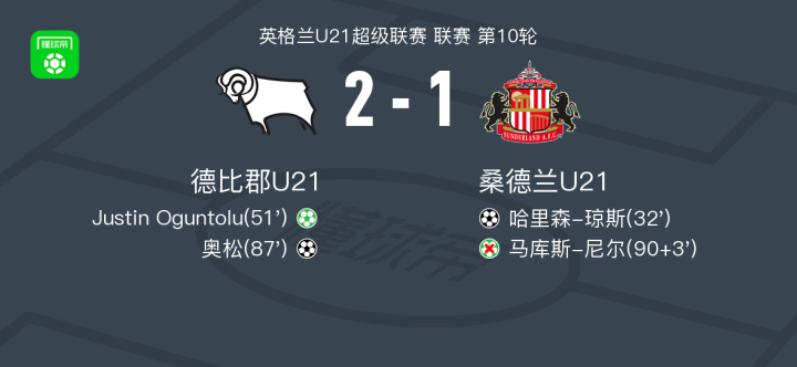 北京时间4月7日英格兰U21超级联赛 联赛 第10轮,德比郡U21主场对阵桑德兰U21。德比郡U21Justin Oguntolu破门,奥松破门。桑德兰U21哈里森-琼斯破门。最终比分德比郡U21 2-1 桑德兰U21。
