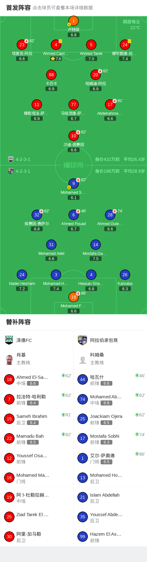 泽德FC0-0阿拉伯承包商,平分秋色战报bot @懂球帝04-07 04:06北京时间4月7日埃及超级联赛 保级组 第2轮,泽德FC主场对阵阿拉伯承包商。最终比分泽德FC 0-0 阿拉伯承包商。点击查看本场比赛详细数据>>点击查看埃及超完整积分榜>>精彩瞬间第31分钟,泽德FC球员马哈茂德-萨比尔将点球罚丢。 球队阵容 技术统计 展开更多