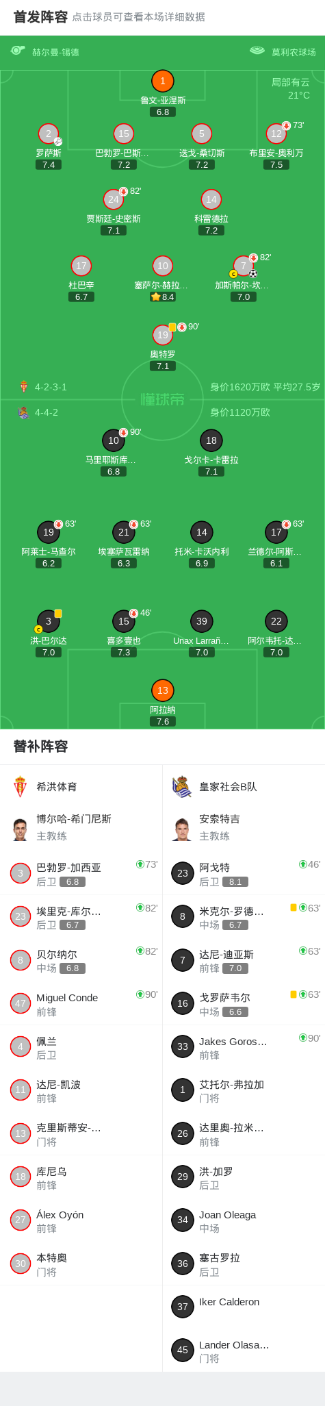 北京时间4月7日西班牙足球乙级联赛 联赛 第34轮,希洪体育主场对阵皇家社会B队。希洪体育加斯帕尔-坎波斯破门。最终比分希洪体育 1-0 皇家社会B队。