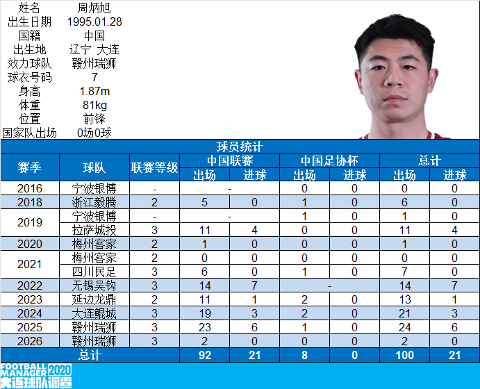 赣州瑞狮队球员周炳旭俱乐部各项职业赛事出场100场 FM大连球队调查员 FM大连球队调查员2026-04-07 08:58【里程碑】赣州瑞狮队球员周炳旭俱乐部各项职业赛事出场100场(4月4日,赣州瑞狮1-1江西庐山)展开更多
