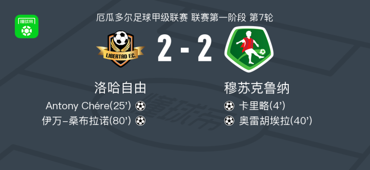 北京时间4月7日厄瓜多尔足球甲级联赛 联赛第一阶段 第7轮,洛哈自由主场对阵穆苏克鲁纳。洛哈自由Antony Chére破门,伊万-桑布拉诺破门。穆苏克鲁纳卡里略破门,奥雷胡埃拉破门。最终比分洛哈自由 2-2 穆苏克鲁纳。