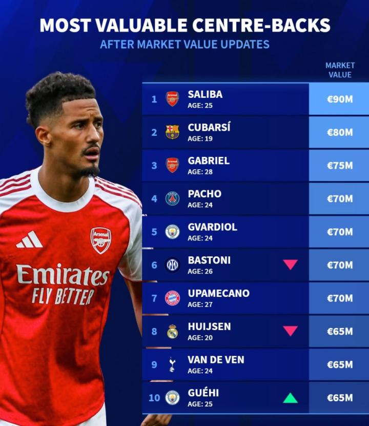 北京时间4月7日,德转列出了目前世界足坛身价排名前10的中后卫,萨利巴以9000万欧元排名第一,库巴西8000万欧元第二,加布里埃尔7500万欧元第三。