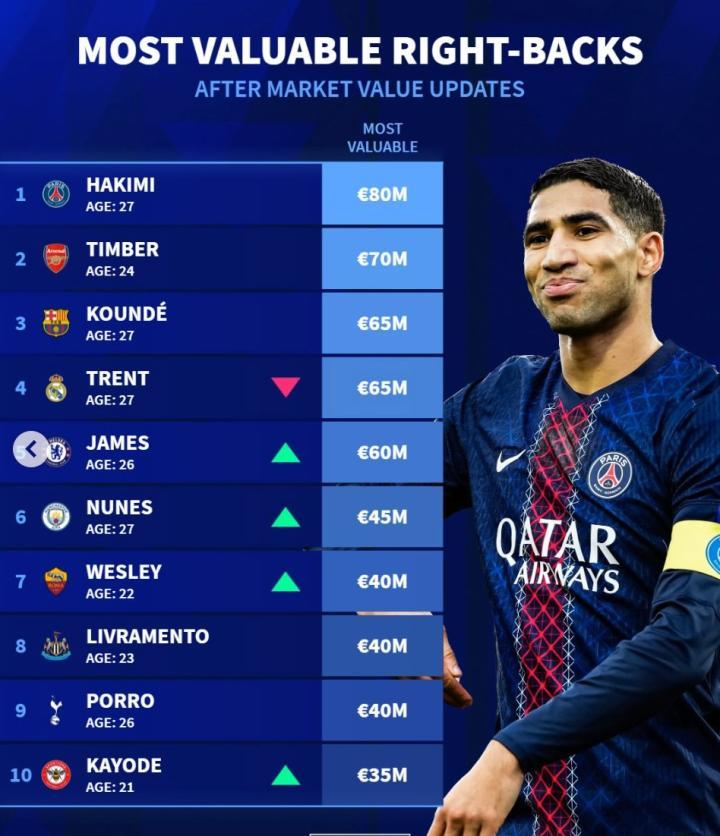 北京时间4月7日,德转列出了目前世界足坛身价排名前10的右后卫,阿什拉夫以8000万欧元排名第一,廷贝尔7000万欧元第二,孔德6500万欧元第三。