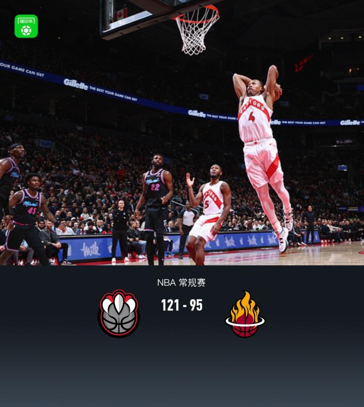 第四节猛龙珀尔特尔拿下7分,热火凯沙德-约翰逊拿下7分,最终猛龙121-95战胜热火