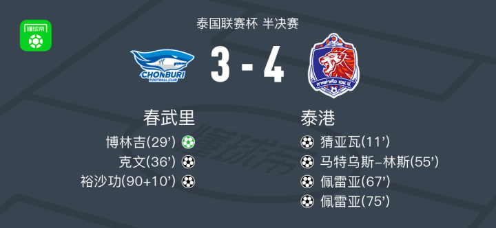 北京时间4月8日泰国联赛杯 半决赛,春武里对阵泰港。春武里博林吉破门,克文破门,裕沙功破门。泰港猜亚瓦破门,马特乌斯-林斯破门,佩雷亚梅开二度。最终比分春武里 3-4 泰港。