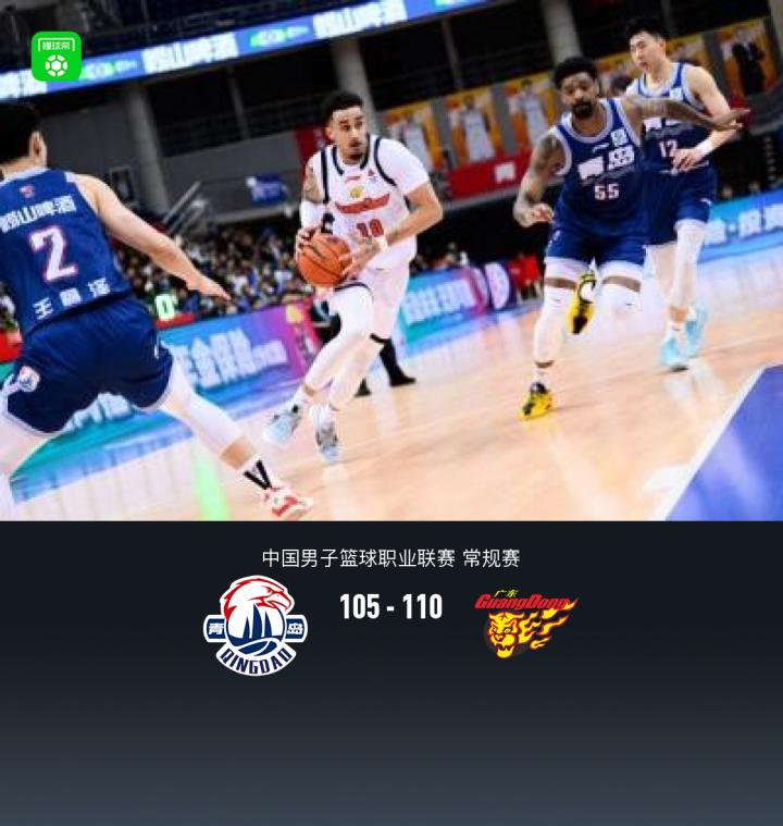 北京时间4月8日中国男子篮球职业联赛 常规赛,青岛崂山啤酒对阵广东东阳光。半场青岛58-50广东,第三节青岛最大领先16分,三节结束仍领先13分,末节广东展开反扑,常规时间最后阶段麦考尔三分绝平98平进加时,加时赛最后阶段广东领先3分,胡明轩两罚全丢,但是青岛赵嘉义传球韦瑟斯庞出现致命失误,最终广东110-105青岛。