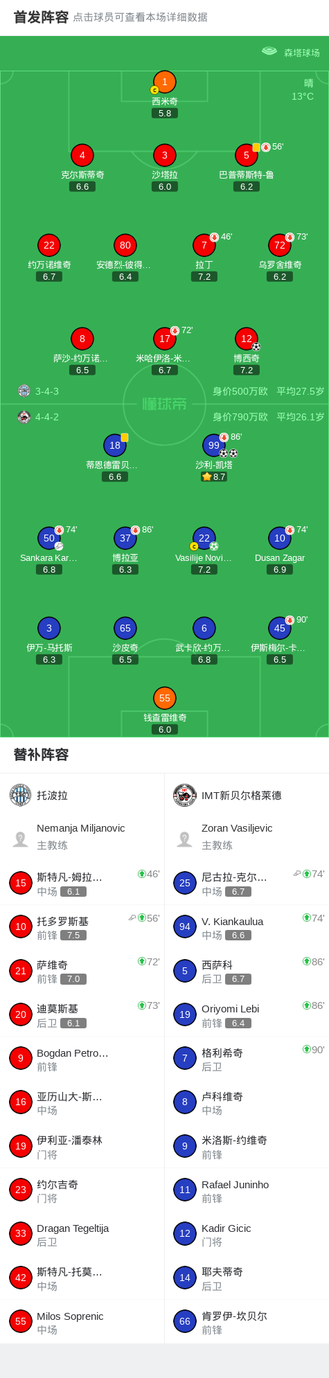 IMT新贝尔格莱德3-1托波拉,沙利-凯塔两球,Vasilije Novicic点射破门
