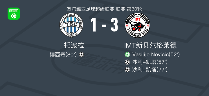北京时间4月8日塞尔维亚足球超级联赛 联赛 第30轮,托波拉主场对阵IMT新贝尔格莱德。托波拉博西奇破门。IMT新贝尔格莱德Vasilije Novicic破门,沙利-凯塔梅开二度。最终比分托波拉 1-3 IMT新贝尔格莱德。