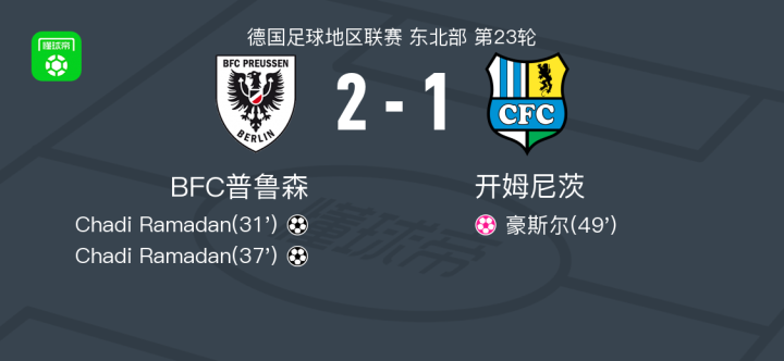 北京时间4月8日德国足球地区联赛 东北部 第23轮,BFC普鲁森主场对阵开姆尼茨。BFC普鲁森Chadi Ramadan梅开二度,豪斯尔自摆乌龙。最终比分BFC普鲁森 2-1 开姆尼茨。