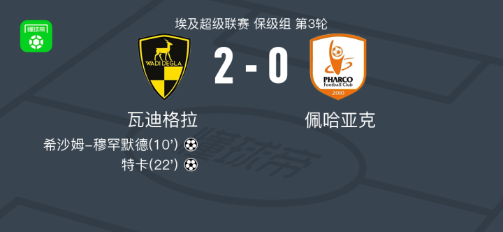 北京时间4月8日埃及超级联赛 保级组 第3轮,瓦迪格拉主场对阵佩哈亚克。瓦迪格拉希沙姆-穆罕默德破门,特卡破门。最终比分瓦迪格拉 2-0 佩哈亚克。