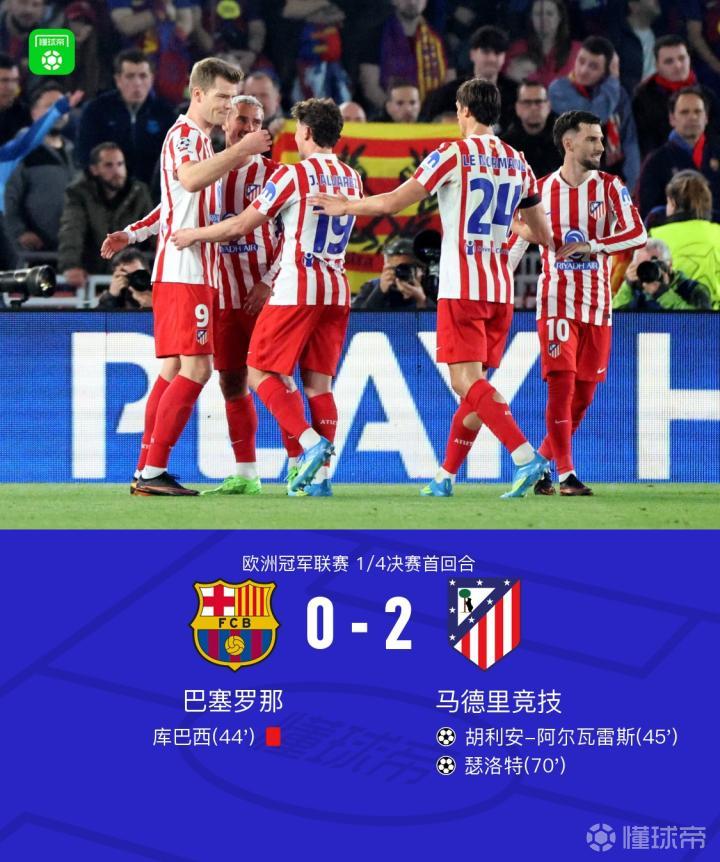 北京时间4月9日欧洲冠军联赛 1/4决赛首回合,巴塞罗那对阵马德里竞技。上半场,拉什福德率先破门,可惜越位在先进球无效。上半场尾声阶段,库巴西放倒小西蒙尼,裁判红牌将其罚下,随后阿尔瓦雷斯直接任意球破门,打破僵局。下半场,鲁杰里传中,瑟洛特门前抢点破门,再下一城。最终比分巴萨0-2马竞。
