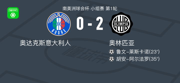 北京时间4月9日南美洲球会杯 小组赛 第1轮,奥达克斯意大利人对阵奥林匹亚。奥林匹亚鲁文-莱斯卡诺破门,胡安-阿尔法罗破门。最终比分奥达克斯意大利人 0-2 奥林匹亚。