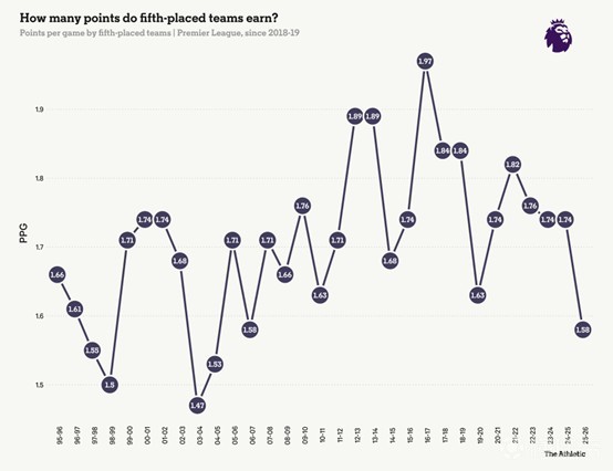 北京时间4月9日,The Athletic发表专题文章,谈论了本赛季英超欧冠资格争夺的乱象,表示当前第五名争夺积分偏低、传统豪门状态低迷,既是席位竞争成色不足的体现,也印证了英超中游球队整体崛起、联赛竞争格局愈发激烈的现状。