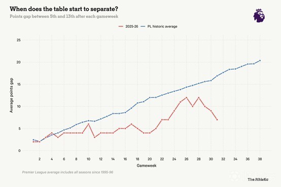这是赛季进行到现阶段,第五名与第十三名之间差距最小的一次。下图显示,通常在31轮比赛过后,这个差距在17分左右。三轮比赛前,这个差距还是12分,但利物浦的下滑为中游球队打开了大门。