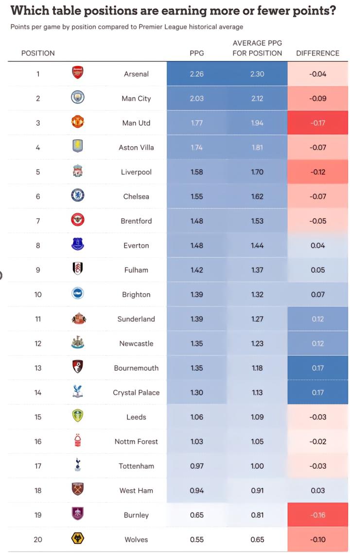 下图显示了本赛季每个排名的场均积分(红点),与之前每个赛季该排名的所有场均积分(灰点)进行对比,小黑线代表平均值。包括领头羊阿森纳在内的所有前七名球队,其场均积分都低于该位置的历史典型值,而他们身后的七支球队则蚕食了他们的积分,比以往同位置的得分更高。
