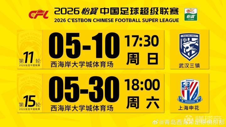 为满足球迷观赛需求,经俱乐部申请,并协商属地赛区、客队俱乐部及相关方同意后, 2026怡宝中超联赛青岛西海岸俱乐部两场主场比赛时间进行了调整,其他比赛安排不变,具体调整如下: