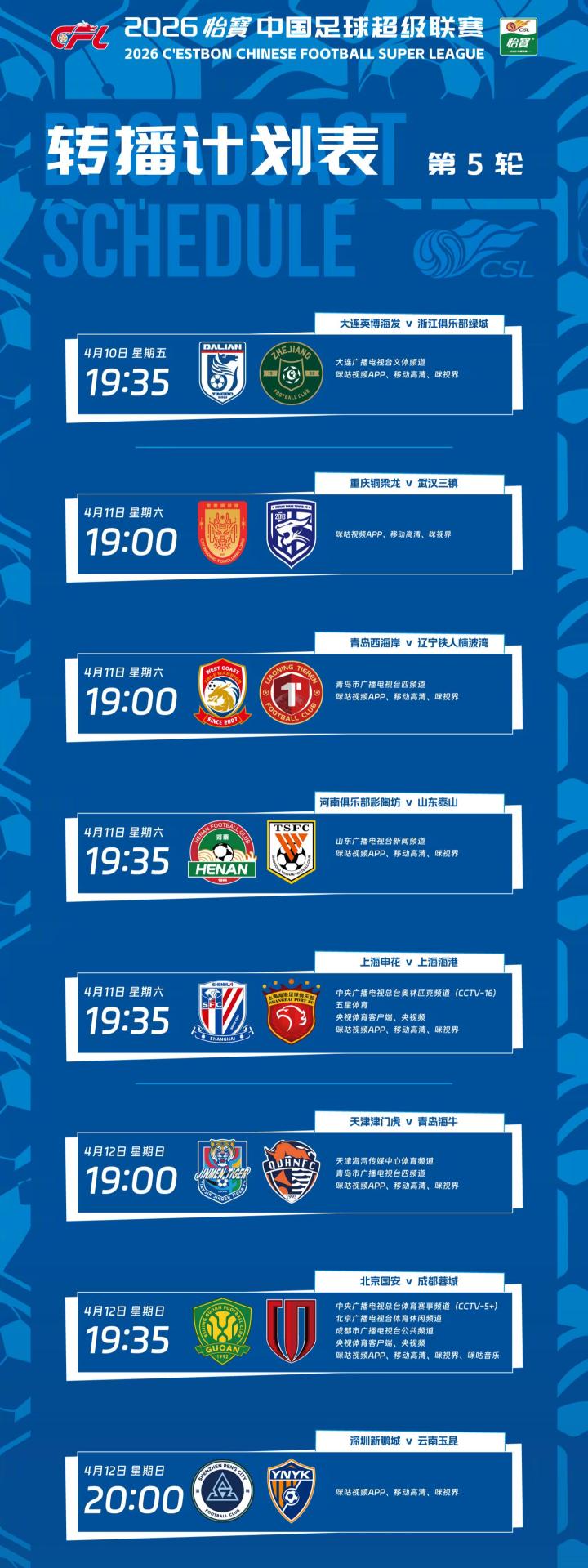 4月10日至12日,2026赛季中超联赛将展开第5轮较量。赛前,中超官方发布了本轮转播计划表。根据转播计划,本轮8场比赛都有网络平台直播,6场比赛还有电视平台直播。