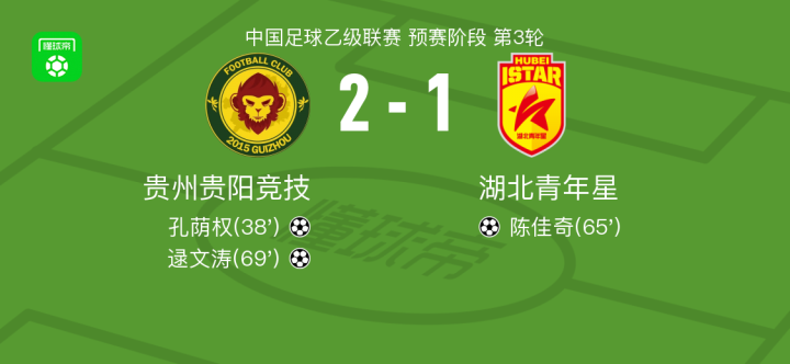 北京时间4月9日中国足球乙级联赛 预赛阶段 第3轮,贵州贵阳竞技主场对阵湖北青年星。贵州贵阳竞技孔荫权破门,逯文涛破门。湖北青年星陈佳奇破门。最终比分贵州贵阳竞技 2-1 湖北青年星。