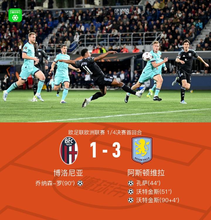 北京时间4月10日欧足联欧洲联赛 1/4决赛首回合,博洛尼亚对阵阿斯顿维拉。上半场孔萨首开记录,下半场沃特金斯破门扩大比分,90分钟乔纳森-罗扳回一球,随后沃特金斯破门梅开二度。最终比分博洛尼亚 1-3 阿斯顿维拉。