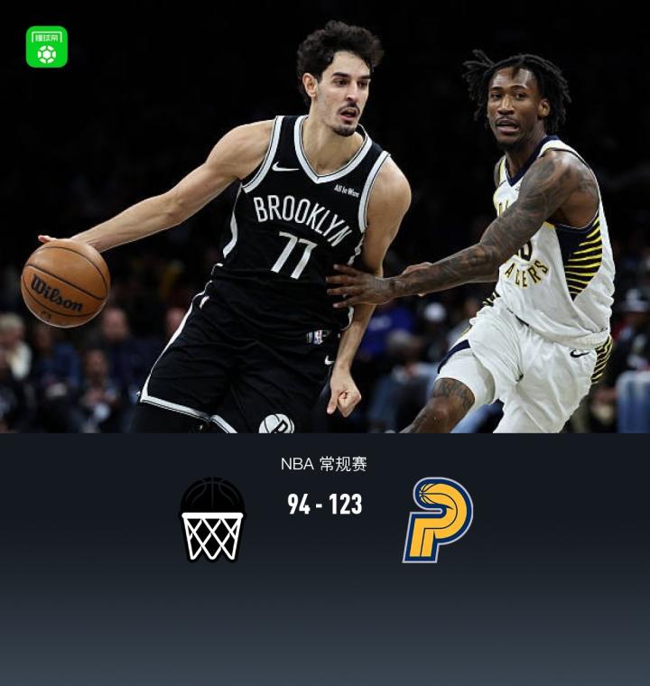 第四节篮网EJ-里德尔拿下11分,步行者迈卡-波特拿下8分,最终篮网94-123不敌步行者