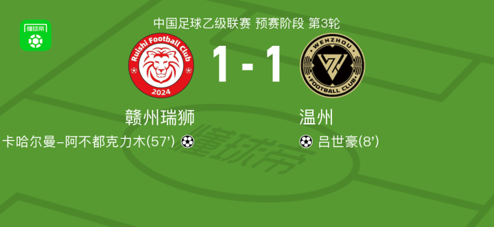 北京时间4月10日中国足球乙级联赛 预赛阶段 第3轮,赣州瑞狮主场对阵温州。赣州瑞狮卡哈尔曼-阿不都克力木破门。温州吕世豪破门。最终比分赣州瑞狮 1-1 温州。