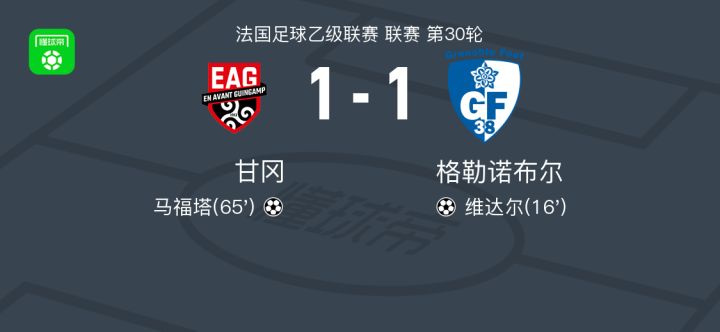 北京时间4月11日法国足球乙级联赛 联赛 第30轮,甘冈主场对阵格勒诺布尔。甘冈马福塔破门。格勒诺布尔维达尔破门。最终比分甘冈 1-1 格勒诺布尔。