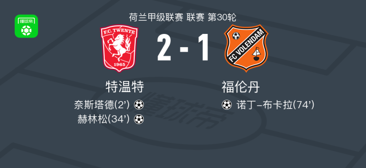 北京时间4月11日荷兰甲级联赛 联赛 第30轮,特温特主场对阵福伦丹。特温特奈斯塔德破门,赫林松破门。福伦丹诺丁-布卡拉破门。最终比分特温特 2-1 福伦丹。