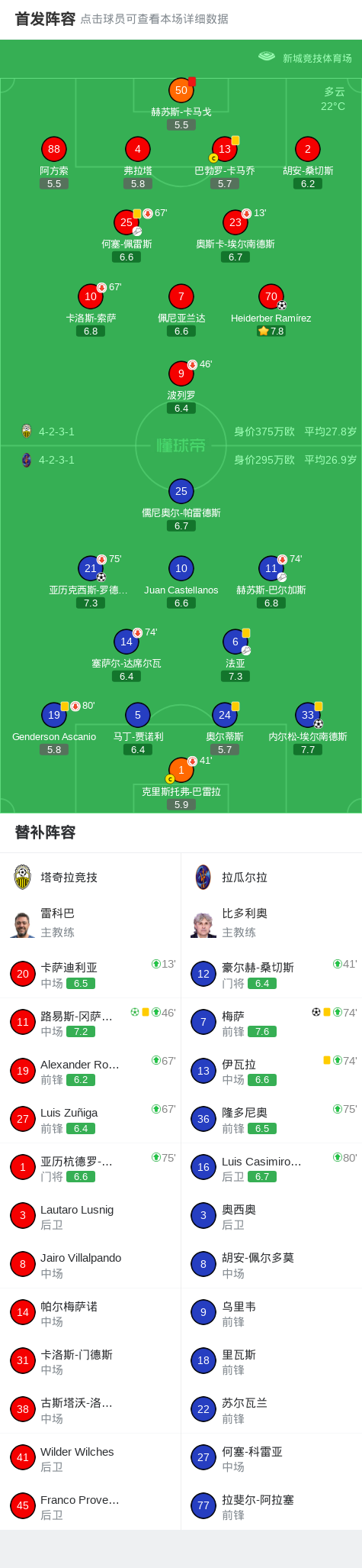 第72分钟,塔奇拉竞技球队赫苏斯-卡马戈吃到红牌。