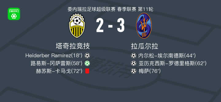 北京时间4月11日委内瑞拉足球超级联赛 春季联赛 第11轮,塔奇拉竞技主场对阵拉瓜尔拉。塔奇拉竞技Heiderber Ramírez破门,路易斯-冈萨雷斯破门。拉瓜尔拉内尔松-埃尔南德斯破门,亚历克西斯-罗德里格斯破门,梅萨破门。最终比分塔奇拉竞技 2-3 拉瓜尔拉。