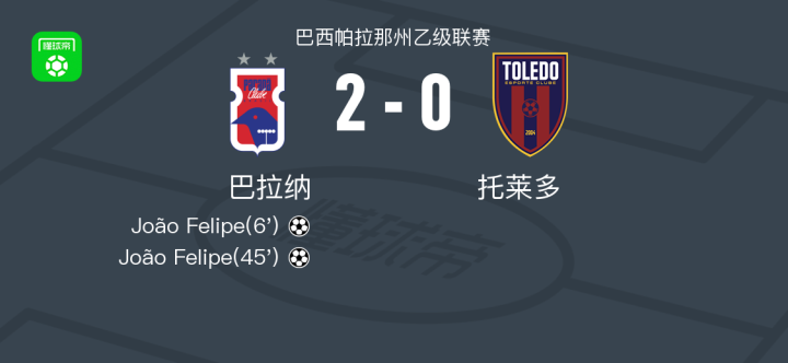 巴拉纳2-0托莱多取巴帕拉乙5连胜,João Felipe独中两元战报bot @懂球帝04-11 08:52北京时间4月11日巴西帕拉那州乙级联赛,巴拉纳主场对阵托莱多。巴拉纳João Felipe梅开二度。最终比分巴拉纳 2-0 托莱多。点击查看本场比赛详细数据>>精彩瞬间第6分钟,巴拉纳球员João Felipe打入一球。第45分钟,巴拉纳球员João Felipe打入一球。 技术统计 展开更多