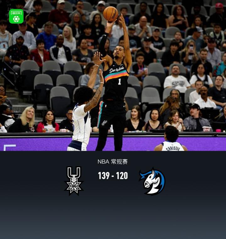 第四节马刺哈里森-巴恩斯拿下8分,独行侠约翰-波拉基达斯拿下9分,最终马刺139-120战胜独行侠