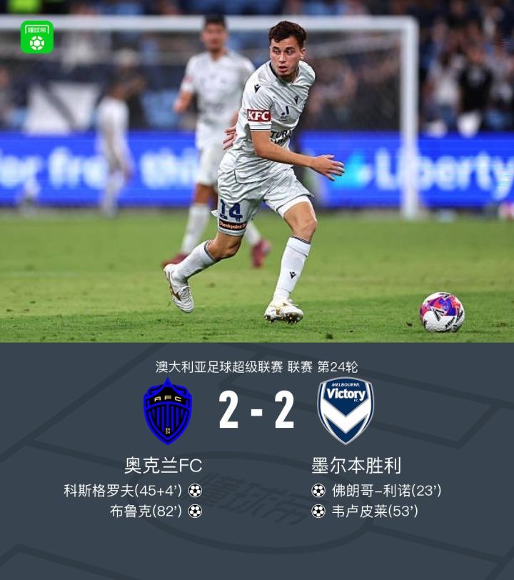 北京时间4月11日澳大利亚足球超级联赛第24轮,奥克兰FC主场迎战墨尔本胜利。比赛中,墨尔本胜利球员通过配合由佛朗哥-利诺率先破门;上半场临近结束时,奥克兰FC球员科斯格罗夫打入一球扳平比分;下半场墨尔本胜利球员韦卢皮莱再下一城;随后奥克兰FC球员布鲁克破门,最终双方战成2-2平。