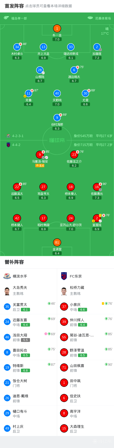 第45分钟,马塞洛-瑞安传中,佐藤惠允破门,FC东京1-0横滨水手