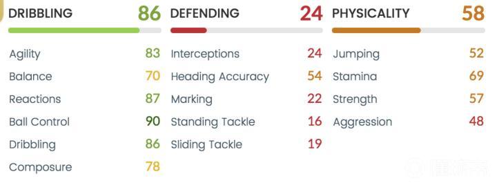 厄齐尔的防守Defending: Marking(22)x 0.3 + Stand Tackle(16)x 0.3 + Interceptions(24)x 0.2 +Heading Acc(54)x 0.1 +Slide Tackle(19)x 0.1=23.5约等于24
