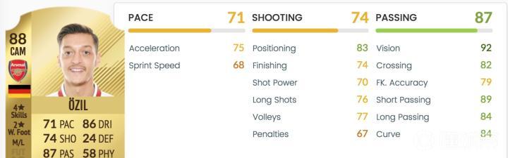 厄齐尔的传球能力Passing: Short Pass(89)x 0.35 + Vision(92)x 0.2 + Crossing(82)x 0.2 + Long Pass(84)x 0.15 + Curve(84)x 0.05 + Freekick Accuracy(79)x 0.05=86.7约等于87