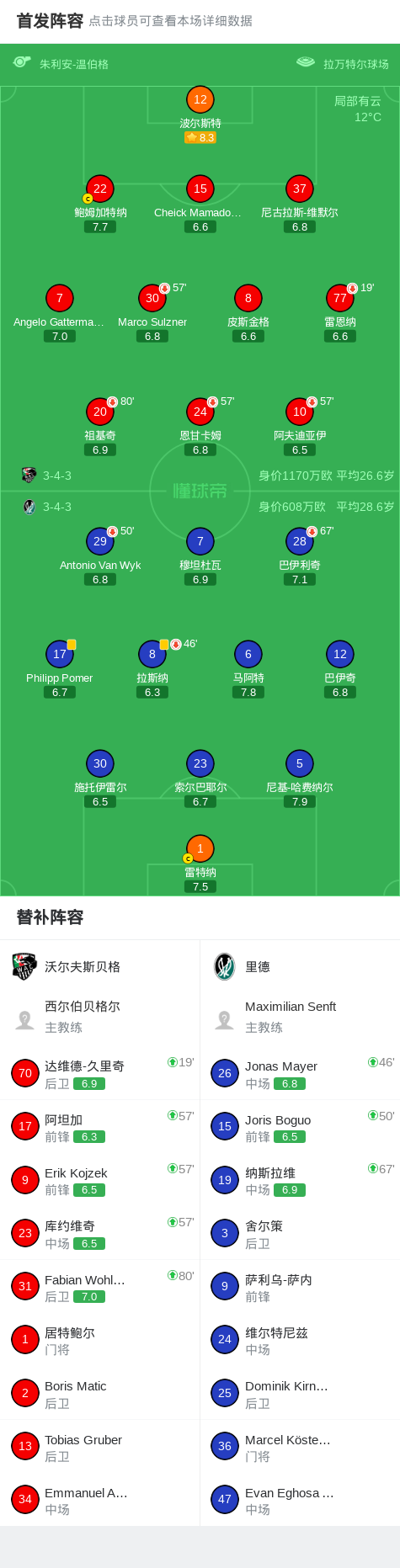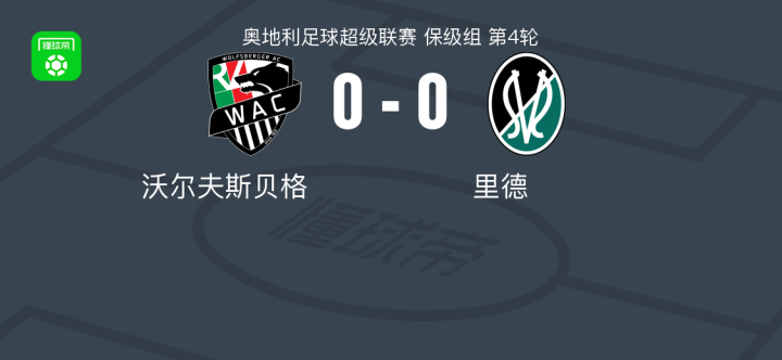 沃尔夫斯贝格0-0里德,秋色平分战报bot @懂球帝04-12 00:51北京时间4月11日奥地利足球超级联赛 保级组 第4轮,沃尔夫斯贝格主场对阵里德。最终比分沃尔夫斯贝格 0-0 里德。点击查看本场比赛详细数据>>点击查看奥超完整积分榜>> 球队阵容 技术统计 展开更多