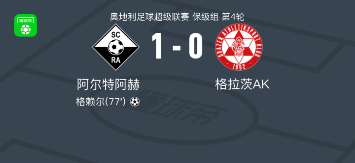 北京时间4月11日奥地利足球超级联赛 保级组 第4轮,阿尔特阿赫主场对阵格拉茨AK。阿尔特阿赫格赖尔破门。最终比分阿尔特阿赫 1-0 格拉茨AK。