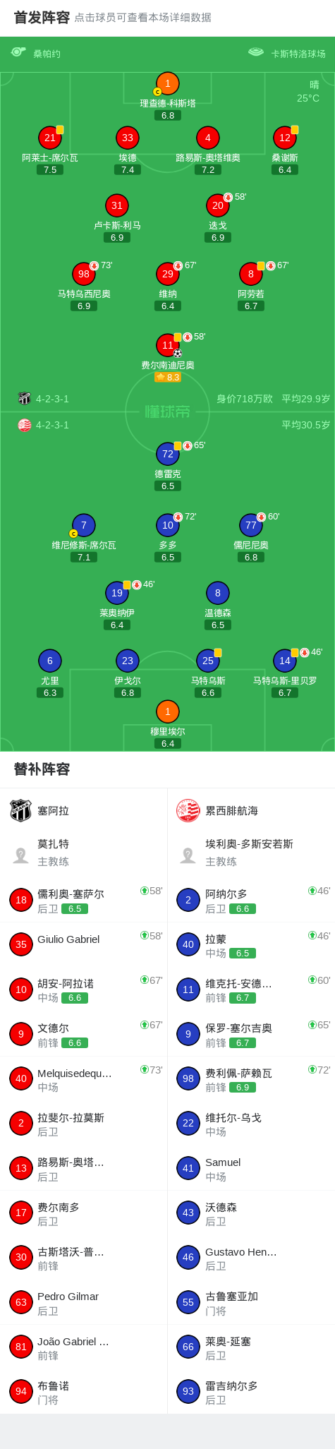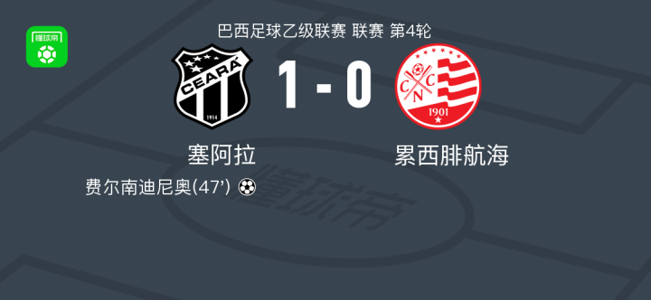 塞阿拉1-0累西腓航海,费尔南迪尼奥制胜球战报bot @懂球帝04-12 09:28北京时间4月12日巴西足球乙级联赛 联赛 第4轮,塞阿拉主场对阵累西腓航海。塞阿拉费尔南迪尼奥破门。最终比分塞阿拉 1-0 累西腓航海。点击查看本场比赛详细数据>>点击查看巴乙完整积分榜>>精彩瞬间第47分钟,塞阿拉球员费尔南迪尼奥打入一球。 球队阵容 技术统计 展开更多