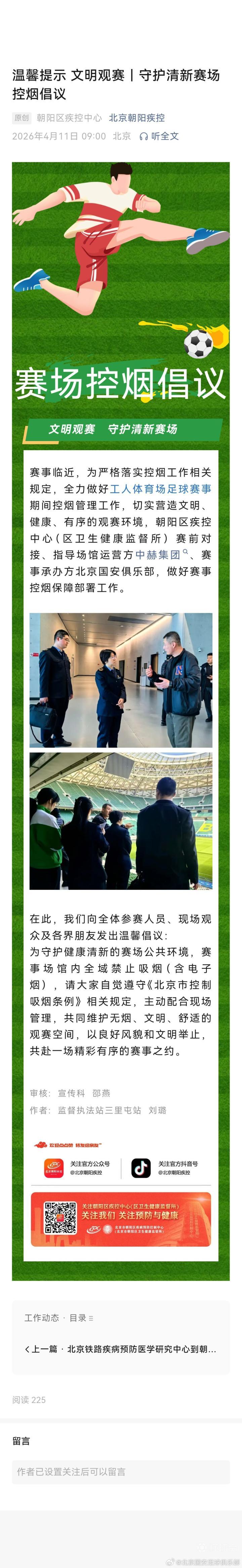 赛事临近,为严格落实控烟工作相关规定,全力做好工人体育场足球赛事期间控烟管理工作,切实营造文明、健康、有序的观赛环境,朝阳区疾控中心(区卫生健康监督所)赛前对接、指导场馆运营方中赫集团、赛事承办方北京国安足球俱乐部,做好赛事控烟保障部署工作。