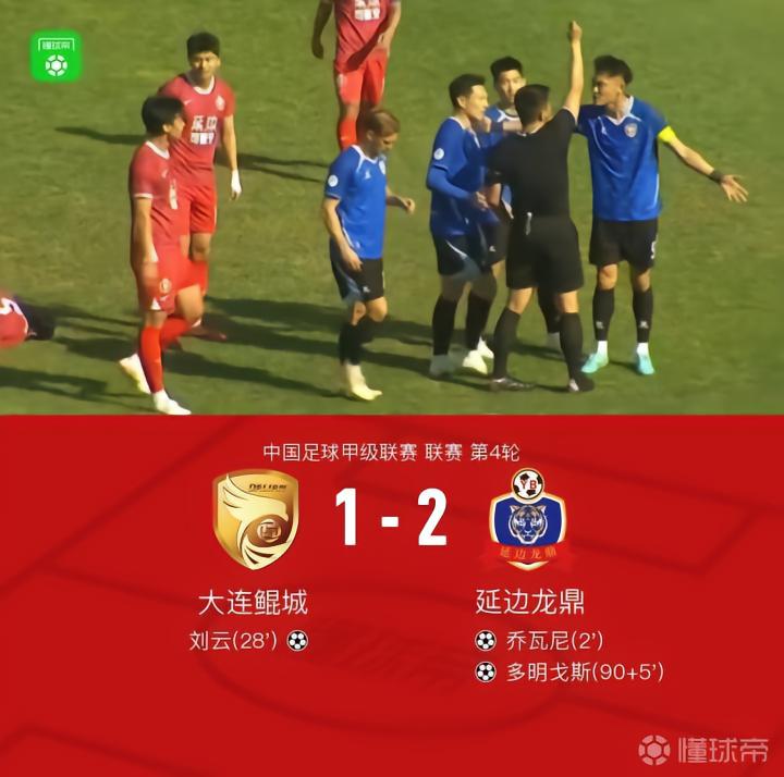 北京时间4月12日中国足球甲级联赛 联赛 第4轮,大连鲲城主场对阵延边龙鼎。大连鲲城刘云破门。延边龙鼎乔瓦尼破门,多明戈斯破门。最终比分大连鲲城 1-2 延边龙鼎。