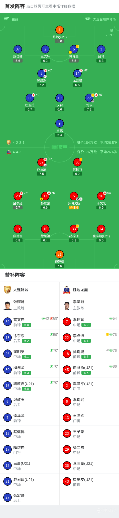 延边龙鼎2-1大连鲲城,多明戈斯传射,乔瓦尼建功
