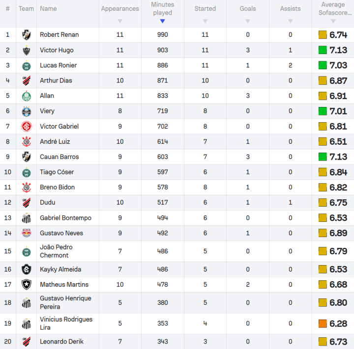 本土U22球员出场时间TOP20