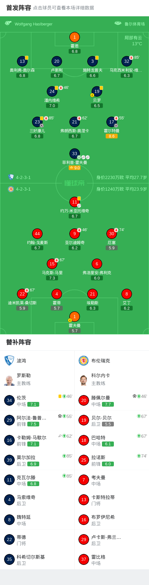 波鸿4-1大胜布伦瑞克,菲利普-霍夫曼1射2传,阿尔法-鲁普雷希特破门