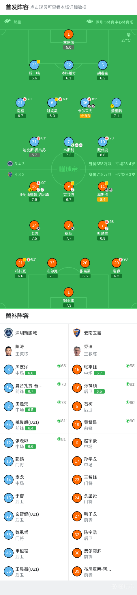北京时间4月12日20:00,中超第5轮继续进行,深圳新鹏城坐镇深圳市体育中心体育场迎战云南玉昆,本场主裁判为熊星,VAR裁判为贺凯。上半场,徐新、卡约、奥斯卡先后破门帮助云南三球领先,随后卡尔采夫梅开二度助新鹏城扳回两球。下半场,奥斯卡再入一球,韦斯利补时阶段点射。最终,云南4-3客胜新鹏城。