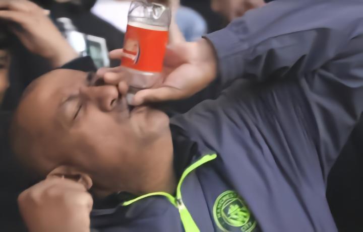 在多库为曼城将比分扩大至3-0后,看台上一位镜头感拉满的曼城球迷拿起印有阿森纳队徽的瓶子“对瓶吹”,长时间占据了转播镜头。