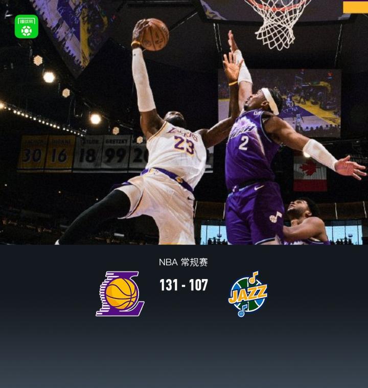 湖人131-107大胜爵士排名西部第四,詹姆斯半场18+6,艾顿22+10,布朗尼11分