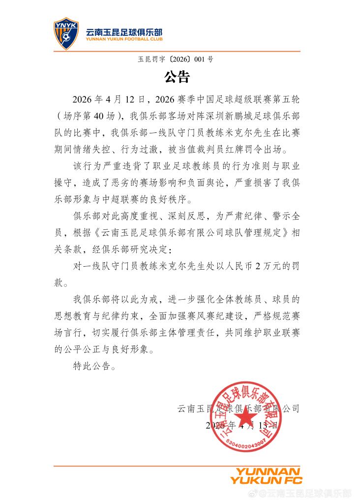 关于我俱乐部一线队守门员教练米克尔先生相关处罚公...云南玉昆足球俱乐部 @懂球帝04-13 18:09关于我俱乐部一线队守门员教练米克尔先生相关处罚公告 我俱乐部将以此为戒,强化全体教练员、球员思想教育与纪律约束,严格规范赛场言行,共同维护职业联赛公平公正与良好形象!展开更多
